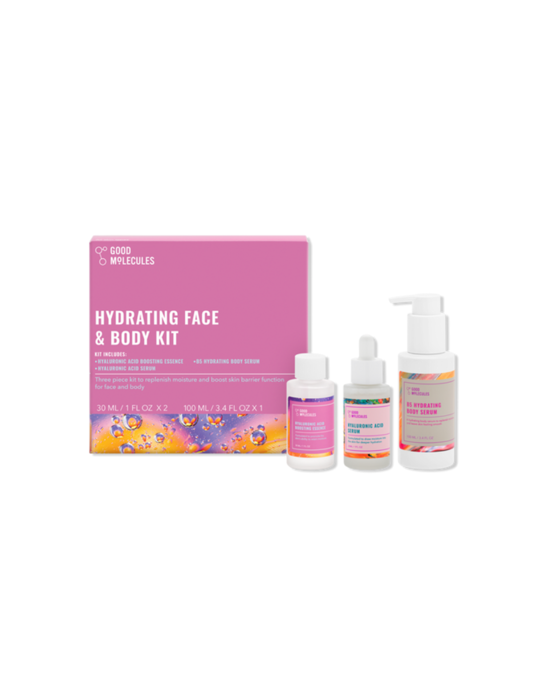 El Good Molecules Hydrating Face & Body Kit es un set de hidratación total para rostro y cuerpo que ayuda a reforzar la barrera cutánea y mantener la piel suave y flexible. Incluye:
